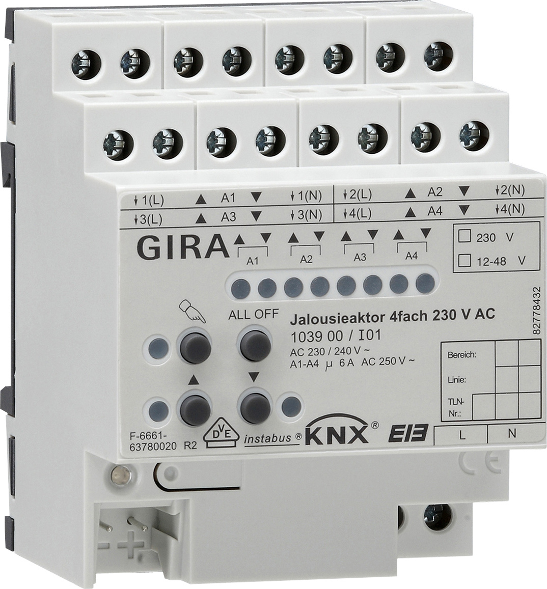 KNX Jaloeziebesturing DIN-rail Jaloezieactoren met geïntegreerde busaankoppelaar, handbediening en statusweergave voor elke uitgang. Voor het aansturen van elektrisch aangedreven jaloezieën, rolluiken, markiezen, ventilatieluiken en soortgelijke raambekledingen.