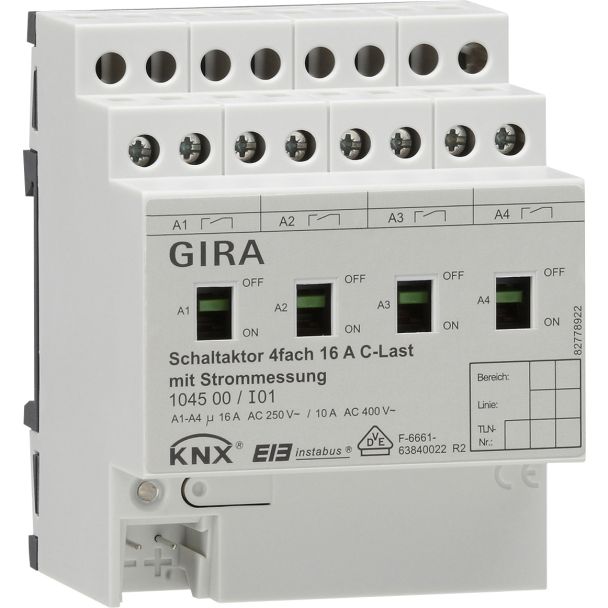 voor KNX Gira KNX systeem DIN-rail DIN-railschakelactoren met geïntegreerde busaankoppelaar. Voor het schakelen van onafhankelijk aan te sturen belastinggroepen. Met handschakelaar voor het omschakelen van het relais (aan/uit) parallel aan of zonder KNX bedrijf. Aansluiting meerfasig. Geen aanvullende voeding vereist.