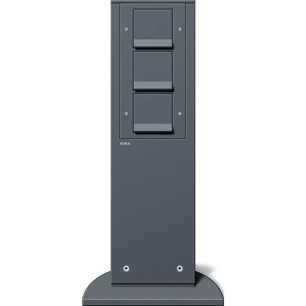 3 wandcontactdozen met randaarde Gira energiezuil en lichtzuilen antraciet Gira energiezuil en lichtzuilen met en zonder lichtelementen voor buiten. De zuilen zijn van gepoedercoat aluminium. De voetelementen bij zuilen tot 1400 mm zijn ook van gepoedercoat aluminium. De voetelementen bij zuilen vanaf 1400 mm zijn van gepoedercoat staal. Elk in de kleur antraciet conform GSB-standaard. Het oppervlak is weer-, uv- en vuilbestendig alsook krasvast.