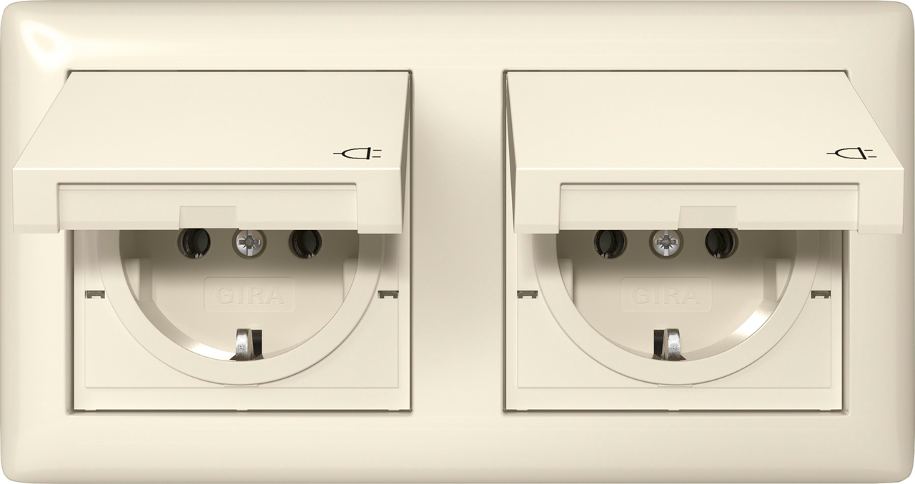 Wandcontactdoos met randaarde 2-voudig 16 A 250 V~met klapdeksel, compleet cremé wit glanzend (415801)