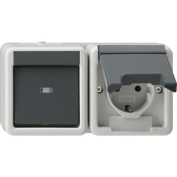 horizontaal, met klapdeksel (onderstuk en bovenstuk) Universele uit-wisselschakelaar Gira spatwaterdicht opbouw IP44 grijs