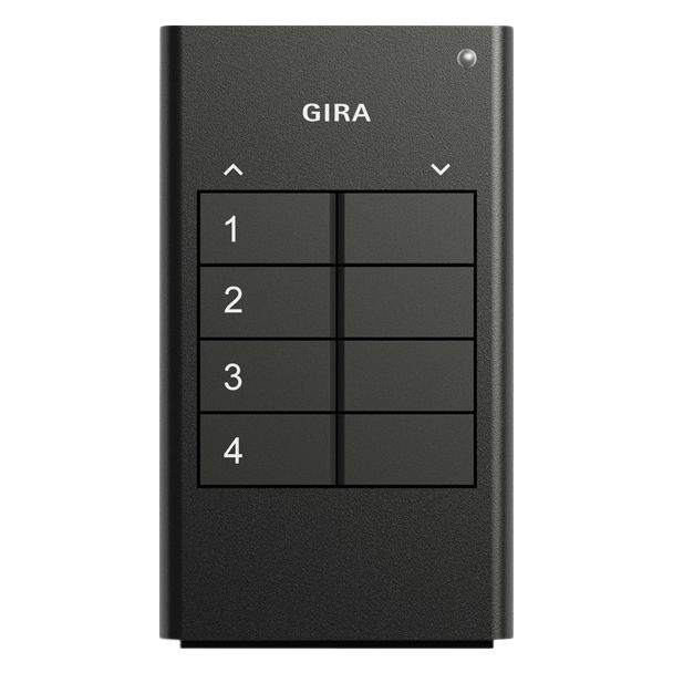 Gira KNX RF antraciet Met de RF handzenders voor KNX wordt de besturing ‘mobiel’: vanaf elk punt in huis kan de gewenste KNX functie comfortabel via ‘afstandsbediening’ worden ingeschakeld. De RF handzenders voor KNX verzenden bij bediening van de toetsen afhankelijk van de parameterinstelling bij geladen applicatieprogramma draadloos KNX telegrammen. Dat kunnen bijvoorbeeld telegrammen zijn voor het schakelen of drukken, voor het dimmen of voor het besturen van de jaloezieën. Daarnaast is het mogelijk waardegeverfuncties te programmeren (dimwaardegevers en scène-neveneenheden).